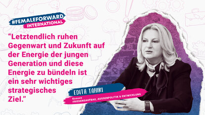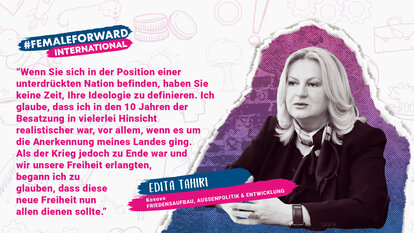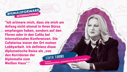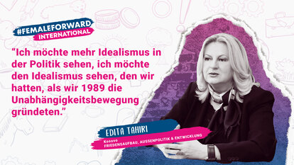 Sie stimmt zwar zu, dass Quoten ein künstliches Instrument sind, stellt jedoch fest, dass sie dazu beigetragen haben, mehr Frauen der Politik auf hoher Ebene auszusetzen und der kosovarischen Gesellschaft zu zeigen, dass das Land ohne sie in Autoritätspositionen nicht hoffen kann, eine echte, funktionierende Demokratie zu entwickeln. „Heute, während wir hier sprechen ist die Lage hinsichtlich der Beteiligung der Frauen in der Regierung besser. Der Präsident ist eine Frau, und das Parlament hat über 30 Prozent Frauenvertretung. Das sind gute Errungenschaften, aber es bleiben Herausforderungen – wir müssen noch nachhaltige geschlechtergerechte Systeme aufbauen“, sagt Tahiri. Ihr Kampf für Geschlechtergleichstellung und geschlechtergerechte Friedensförderung geht auf regionaler Ebene weiter – seit über fünfzehn Jahren ist sie Leiterin der Regional Women’s Lobby in South-East Europe (RWLSEE).