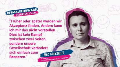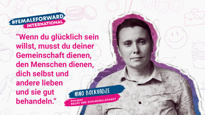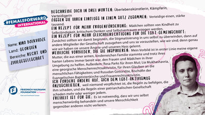 In der zweiten Klasse entwickelte sie als Kind ein Gefühl für Menschenrechte. Sie sah, wie das Schulsystem in Kategorien unterteilt war und versuchte, die Kinder voneinander zu trennen. Einmal sagte ihr ein Lehrer, dass sie sich nicht mit einem Mädchen, mit dem sie sich angefreundet hatte, abgeben sollte, das aus einer armen Minderheitenfamilie stammte. Nino gehorchte nicht. Ihr ausgeprägter Gerechtigkeitssinn und ihr Wunsch, ihrem Vater zu helfen, der vom harten sowjetischen Strafvollzug dauerhaft geschädigt war, führten sie im Alter von 16 Jahren zum Jurastudium. Als Anwältin und Aktivistin unterstützt Nino unermüdlich LGBT-Menschen in Georgien, hält Vorlesungen an Universitäten und kreiert verschiedene Kunstprojekte, bei denen sie sich von ihrer Liebe zum Lesen inspirieren lässt. Es gibt immer noch Orte, an welche sie nicht geht, aber ihr Haus in einem Dorf in Gurien gehört nicht dazu: Sie wird von ihrer Familie akzeptiert und kommt mit ihrer Partnerin zu Besuch dorthin. Manchmal verbindet das Leben Menschen auf andere Weise: Vor einigen Jahren wurde Nino mit einer Thrombose ins Krankenhaus eingeliefert, ihre Überlebenschancen waren ungewiss. Die Ärzte erkannten sie, aber sie interessierten sich nicht für ihre sexuelle Orientierung und verbrachten Nächte damit, sie zu pflegen. Und als andere Patienten sahen, wie ihre Partnerin sie pflegte, ihre Hand hielt und neben dem Bett saß, wurde der anfängliche Schock durch das gemeinsame Erleben der Notlage in Verständnis verwandelt. Politiker irren sich, wenn sie glauben, dass eine Mobilisierung „gegen" etwas auf Dauer funktioniert. Das Christentum hat dazu beigetragen, Georgien als Land zu retten, aber Verfolgung und Hass sind keine christlichen Werte und werden nach hinten losgehen. Deshalb sind Bildungs- und Justizreformen notwendig, Georgiens Demokratie wird ohne diese beiden Säulen zerbrechen.“