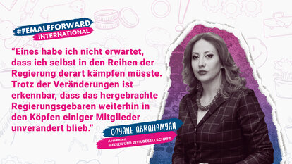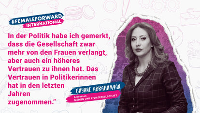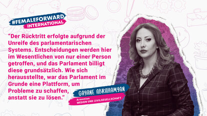 „Stereotypen dominieren immer noch die armenische Gesellschaft - Frauen unterliegen in allen Bereichen beständigem Druck.“ Für Abrahamyan war dieser Druck in der Politik am deutlichsten zu spüren. „Die größte Herausforderung sind die höheren Hürden, die Frauen im Vergleich zu Männern zu bezwingen haben. Weiblichen Persönlichkeiten des öffentlichen Lebens werden nicht einmal kleinste Fehler verziehen. Ihnen wird mehr Professionalität und Aktivität abverlangt. Das ist natürlich jedoch nicht nur in Armenien Realität.“