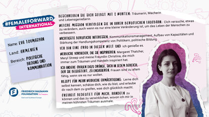 Die Pressesekretärin des armenischen Verfassungsgerichts, Eva Tovmasyan, ist eine Meisterin der Kommunikation. Sie verfügt über eine umfangreiche Erfahrung im zivilgesellschaftlichen Bereich und fühlt sich in der Politik heimisch. Sie erzählt, wie sie dazu kam, sich in der Zivilgesellschaft zu engagieren, und warum sie es für ihre Pflicht hält, andere zu inspirieren.