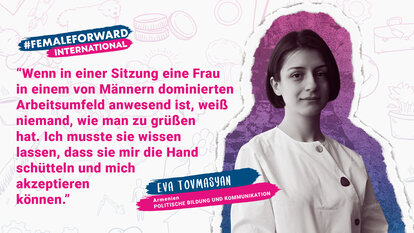 Armenien stützt sich auf bestimmte Quotenkriterien für die Präsenz von Frauen, aber Eva glaubt an einen noch besseren Ansatz: die Förderung der Beteiligung von Frauen an der Basis. Wenn die Gesellschaft es tut, werden Frauen nicht mehr nur hinter den Kulissen agieren oder nur Instrumente sein, um nominelle Quoten zu erfüllen. Wenn sich die Menschen engagieren, so Eva, wird die Gesellschaft in ihrer ganzen Vielfalt proportional vertreten sein. Sobald die notwendigen Schritte auf Parteiebene unternommen werden, wird es den „großen Kampf“ um die Gleichstellung nicht mehr geben, denn der natürliche Übergang vom bürgerlichen Engagement zu den Parteistrukturen wird damit enden, dass andere Menschen ins Parlament einziehen.