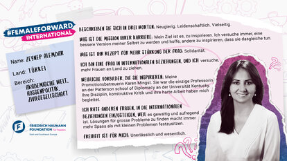 Als Akademikerin aber auch als Person mit Einfluss in der Zivilgesellschaft fokussiert sie sich darauf, die weibliche Perspektive sowohl in lokalen, als auch in globalen Entscheidungsfindungsprozessen voranzutreiben. Zusammen mit Dr Christina Bache und Rand Birnen, zwei Damen aus unterschiedlichen Bereichen aber mit einem Hintergrund in internationalen Beziehungen, gründete Alemdar Women in Foreign Policy in Turkey. Das Ziel dieser Initiative ist es, die kritische Bedeutung der Frauen in der internationalen Konfliktlösung zur Geltung zu bringen und Frauen einen sicheren Raum zu geben, damit sie über diese Themen sprechen.