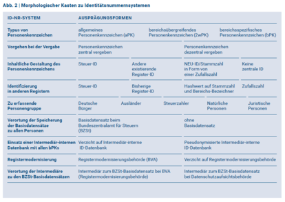 Zu jedem Eintrag im Identifizierungsnummernsystem können Basisdaten vorgehalten werden, etwa im Bundeszentralamt für Steuern. Dies ist denkbar, wenn mit ihrer Hilfe die Datenqualität in den angeschlossenen Registern verbessert, eine Registerbereinigung anvisiert oder eine Registerzentralisierung verfolgt werden soll. Ein solches Basisdatenregister könnte auch nur zeitlich begrenzt für die Dauer der Datenqualitätssicherung eingerichtet werden. Aus Gründen des Datenschutzes und der Datenminimierung könnte andererseits auch auf ein Basisdatenregister verzichtet werden.