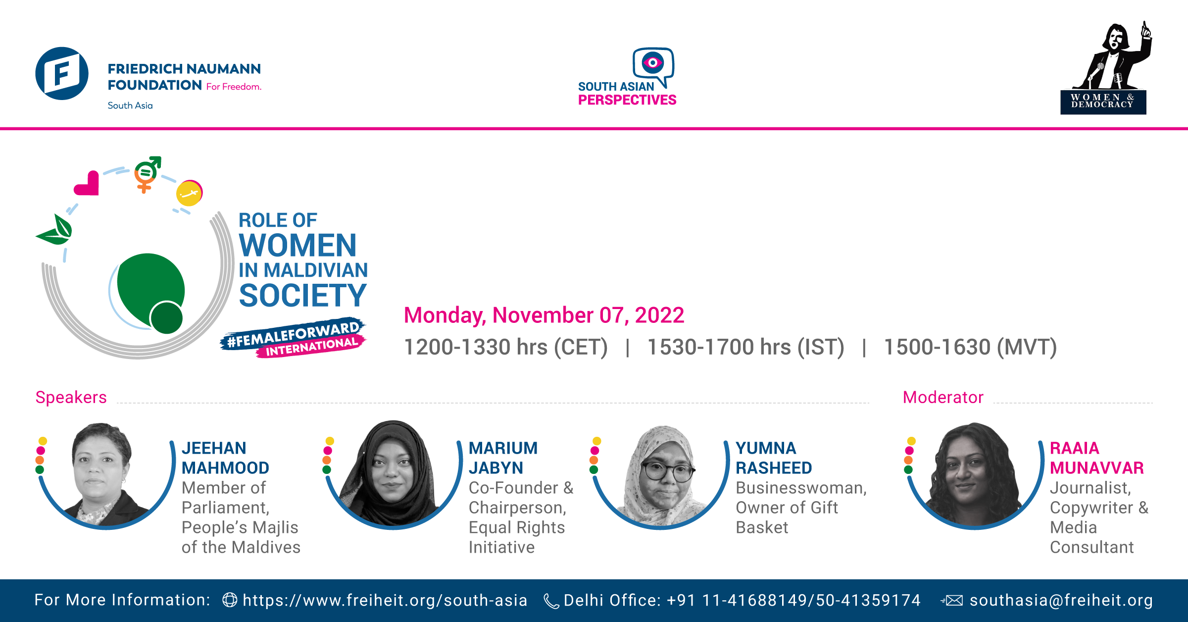 Auf einer Online-Veranstaltung der Friedrich-Naumann-Stiftung für die Freiheit (FNF) Anfang November 2022 beleuchteten Expertinnen, welchen Beitrag die Frauen der Malediven für die Wirtschaft leisten, wie es um die Gleichberechtigung steht und welchen Grad an politischer und gesellschaftlicher Freiheit sie erreicht haben.
