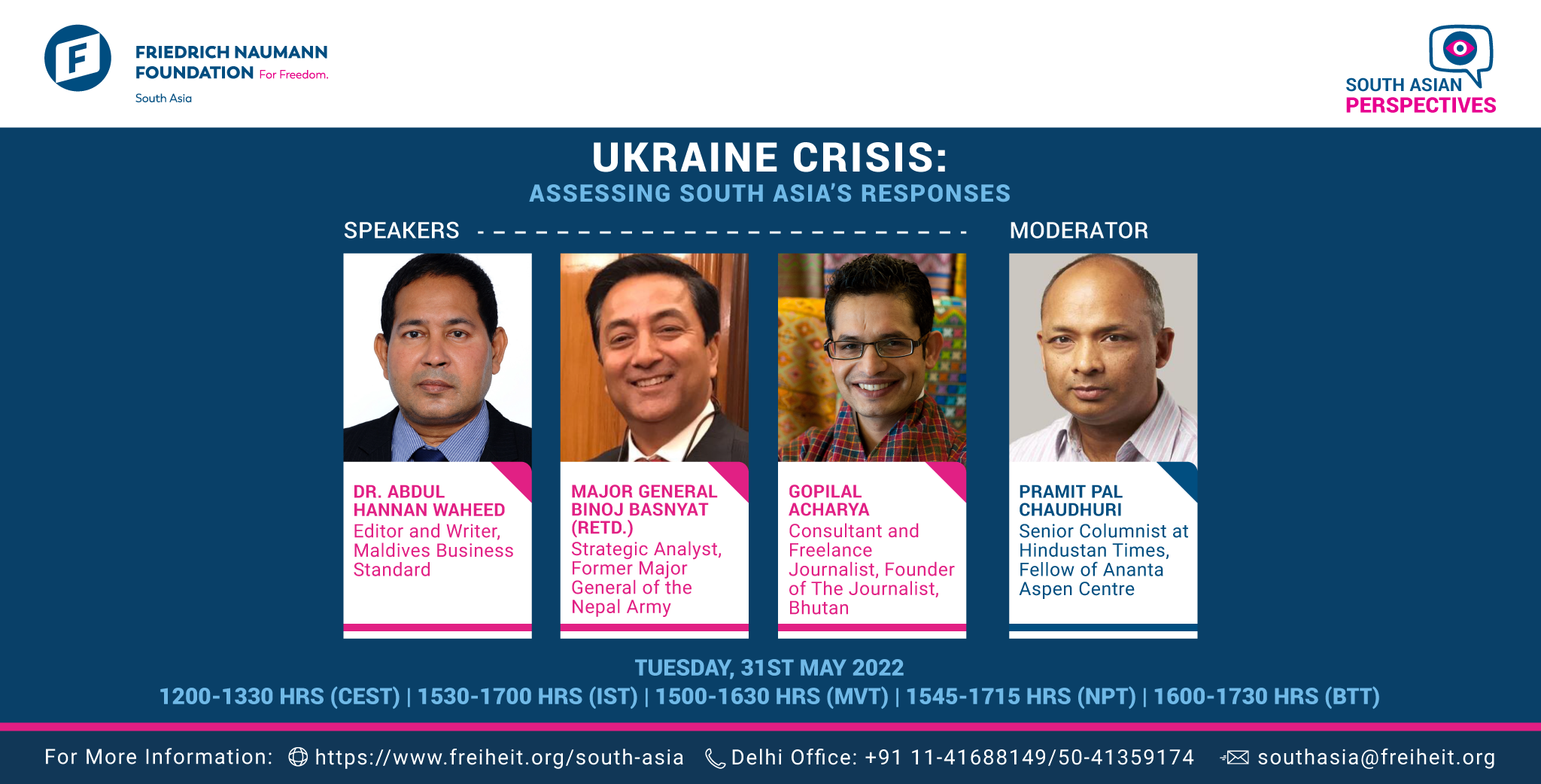 Über die Hintergründe der geopolitischen Meinungsverschiedenheiten diskutierten Ende Mai politische Beobachter aus Nepal, Bhutan und den Malediven bei der Online-Diskussion "Ukraine Crisis: Assessing South Asia’s Responses", die das Südasien-Büro der Friedrich-Naumann-Stiftung veranstaltete. Im Zentrum stand dabei die Sorge vor einer Abkehr von der regelbasierten internationalen Ordnung, unter der militärisch schwache Staaten besonders zu leiden hätten.
