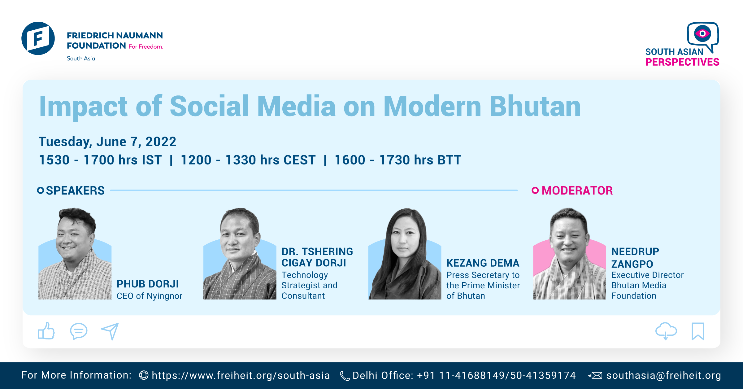 © FNF South AsiaAls bislang einziges Land der Welt misst das kleine Königreich Bhutan im Himalaya das Bruttonationalglück. Es beruht auf vier Säulen: ökologischer Nachhaltigkeit, nachhaltiger und gerechter wirtschaftlicher Entwicklung, guter Regierungsführung und Gleichheit vor dem Gesetz sowie Förderung eines freien und resilienten Kulturlebens. Nur langsam hat das Land mit seinen gerade mal gut 770.000 Einwohnern die selbst-auferlegte Isolation beendet und sich für die Außenwelt geöffnet. Dazu gehören nicht nur eine moderne Infrastruktur mit einem Flughafen und Straßen, sondern auch ein modernes Bildungs- und Gesundheitssystem sowie Technologie. Ziel des Bergstaates ist es, Bhutan zu digitalisieren, damit alle Bürgerinnen und Bürger Zugang zum Internet haben und auch die öffentliche Verwaltung ihre Services digital anbietet. Das Internet nutzen viele Bürger bereits, um soziale Kampagnen oder Diskussionen in öffentlichen Foren zu organisieren sowie das öffentliche Bewusstsein zu sensibilisieren für Themen rund sozioökonomische Fragen, aber auch Governance, Transparenz oder Korruption. Auf einer Online-Veranstaltung der Friedrich-Naumann-Stiftung für die Freiheit (FNF) Anfang Juni 2022 diskutierten Experten, welchen Einfluss die sozialen Medien heute und künftig auf das moderne Bhutan haben. In zwei vorherigen Webinaren ging es um das Bruttonationalglück sowie die Rolle der Frauen.
