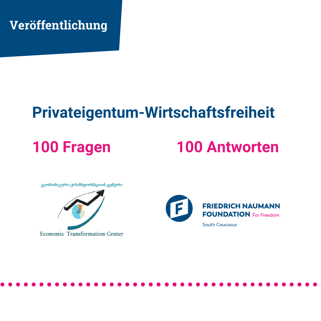 Mit Unterstützung der Friedrich-Naumann-Stiftung präsentieren wir die Publikation mit dem Zentrum für wirtschaftliche Transformation zu aktuellen wirtschaftlichen Trends in Georgien. Die Veröffentlichung enthält 100 wichtige Fragen und Antworten zu den wichtigsten wirtschaftlichen und politischen Fragen Georgiens, die von verschiedenen Personen gestellt und beantwortet werden. Eines der Hauptziele ist es, sich so weit wie möglich mit ihnen zu befassen, damit die Öffentlichkeit ihre Visionen vollständig verstehen und die bestehenden Ursachen, Folgen und möglichen Wege einer möglichen Lösung klarer formulieren kann.