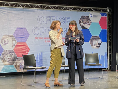 © FNF Global Innovation HubUnser taiwanisches, ausschließlich weibliches Team, spiegelt die Stärkung der Rolle der Frauen in der FNF-Regio Südost- und Ostasien. Ya-wei Chou (Programmmanagerin) und Mia Hallmanns (Kommunikationsbeauftragte) moderierten das Bühnenprogramm zur Büroeröffnung auf Englisch und Mandarin.