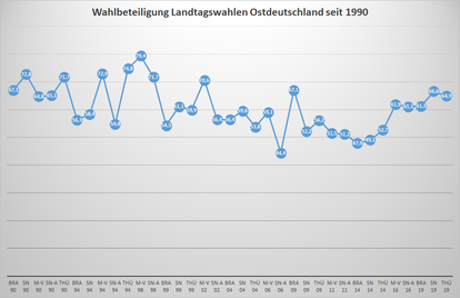 1.099.962 Menschen haben gestern in Thüringen bei der Landtagswahl ihre Stimme gültig abgegeben – zunächst einmal ein erfreuliches Signal, denn damit stieg die Wahlbeteiligung gegenüber der Wahl 2014 um 12,2 Prozentpunkte auf 64,9 Prozent. Die lange Strecke an Wahlen im Osten der Republik, bei der nur relativ wenige Wahlberechtigte ihr Recht auch tatsächlich wahrgenommen haben, scheint beendet: Die Beteiligung lag in allen fünf ostdeutschen Ländern wieder über 60 Prozent: