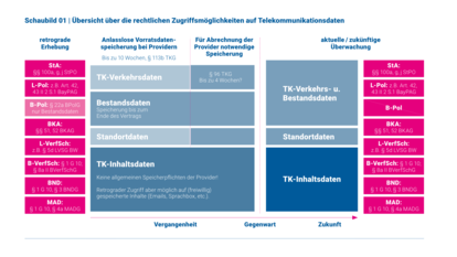 I. Bestandsaufnahme der aktuellen Überwachungslandschaft: Es werden 14 übergeordnete Kategorien von Datenarten identifiziert, auf die von unterschiedlichen Behörden in einer Vielzahl von spezifischen Sachverhalten zugegriffen werden kann. Die so zusammengefügten Überwachungsszenarien reichen von der klassischen Telekommunikationsüberwachung, über die Abfrage von Account-Daten bei Telemediendiensten bis hin zur an- lasslosen Vorratsdatenspeicherung von Kundendaten bei Banken zur Geldwäschekontrolle oder von Flugpas- sagierdaten zur Terrorismusbekämpfung.
