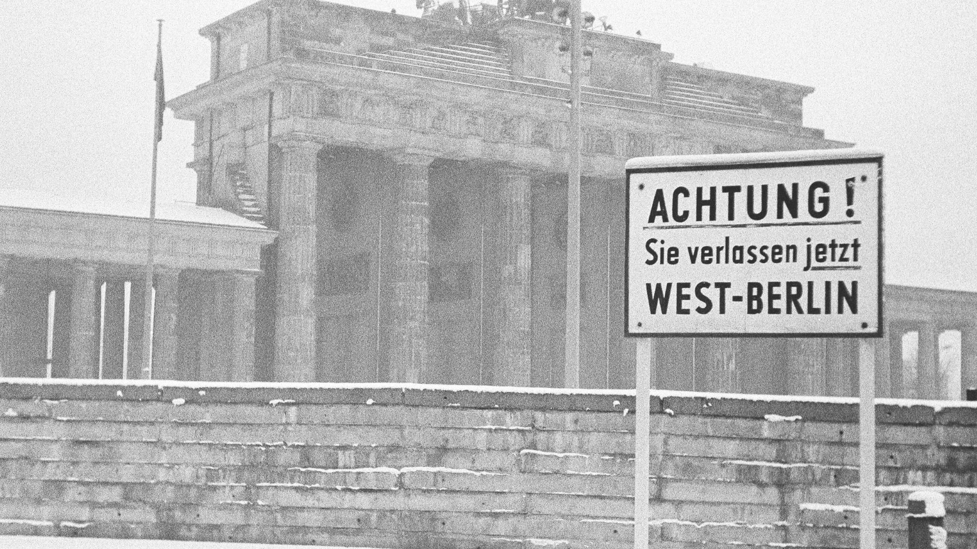 Sechziger Jahre, Schwarzweissfoto, Berliner Mauer in Berlin, Brandenburger Tor, Dezember 1968, Warnschild "Achtung Sie verlassen jetzt West-Berlin".