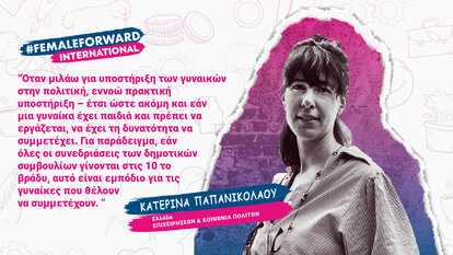 Δεν είναι καθόλου σίγουρη ότι οι γυναίκες έχουν κατακτήσει τον χώρο της πολιτικής στην Ελλάδα και ότι νιώθουν πραγματικά άνετα σε αυτόν. «Δεν είναι σίγουρη ότι πρόκειται για έναν χώρο για γυναίκες. Βλέπουμε πιο πολλές γυναίκες [στην πολιτική], και θα έλεγα ότι τα εμπόδια έχουν μετριαστεί. Στόχος είναι τα εμπόδια να εξαφανιστούν, να μην υπάρχουν φραγμοί και οι γυναίκες να μπορούν εύκολα να ασχοληθούν με την πολιτική», εξηγεί. Η πραγματικότητα όμως διαφέρει. Η Κατερίνα πιστεύει ότι πρέπει να υπάρξει υποστήριξη προκειμένου οι γυναίκες να συμμετέχουν με επιτυχία στην πολιτική ζωή. «Όταν μιλάω για υποστήριξη των γυναικών στην πολιτική, εννοώ πρακτική υποστήριξη - έτσι ώστε ακόμη και εάν μια γυναίκα έχει παιδιά και πρέπει να εργάζεται, να έχει τη δυνατότητα να συμμετέχει. Για παράδειγμα, εάν όλες οι συνεδριάσεις των δημοτικών συμβουλίων γίνονται στις 10 το βράδυ, αυτό είναι εμπόδιο για τις γυναίκες που θέλουν να συμμετέχουν.», εξηγεί.