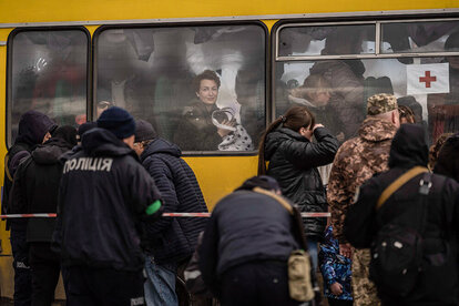 An internally displaced woman looks out the window of a bus after arriving from Mariupol at a center for refugees fleeing Russian attacks, in Zaporizhzhia, Ukraine.