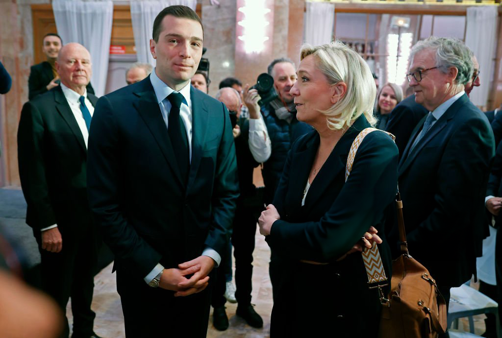 President of the French far-right National Rally (Rassemblement National - RN) party and head of the RN list for the European elections, Jordan Bardella talks with member of parliament and President of the French far-right National Rally party parliamentary group, Marine Le Pen