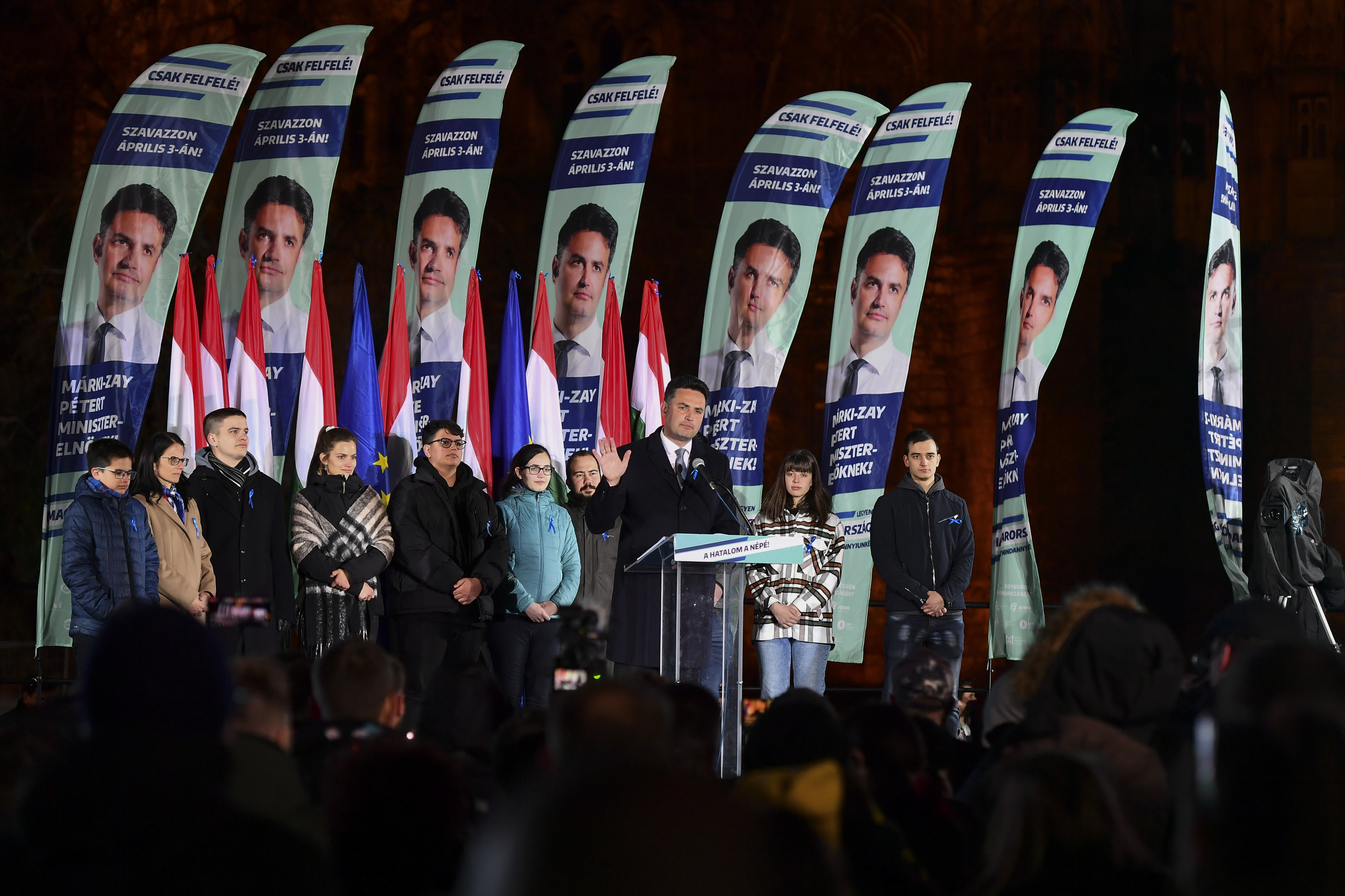 Opposition leader Peter Marki-Zay addresses supporters during an election night rally in Budapest