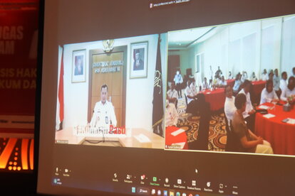 Kanwil Kemenkumham Sulawesi Tengah (menggelar pengukuhan Gugus Tugas Daerah Bisnis dan HAM (GTD BHAM) sekaligus penguatan Pelayanan Publik Berbasis HAM (P2HAM), di Palu, Rabu (29/3). Plt Direktur Jenderal HAM, Dhahana Putra, hadir secara daring menyaksikan kedua agenda yang digelar bersamaan tersebut.