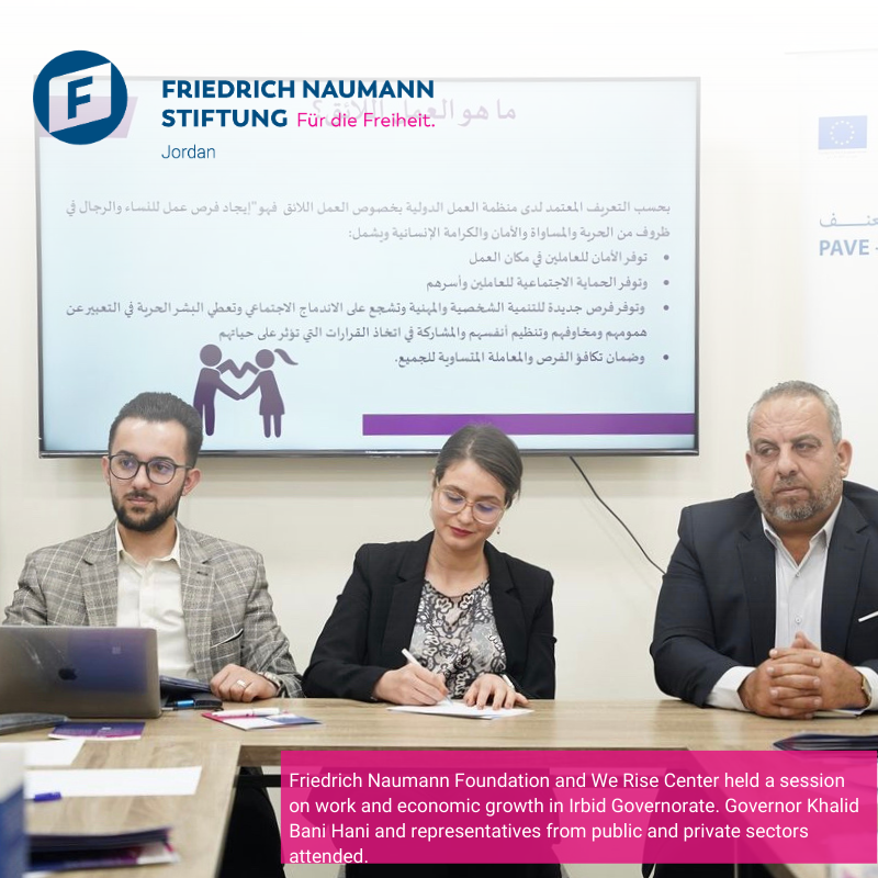 The Friedrich Naumann Foundation for Freedom represented by our EU project coordinator Ms. Lina Al Haj, in cooperation with the @we_rise_center for Sustainable Development, held an intensive session on "Decent Work and Economic Growth, International Agreements, Local Laws, Codes of Conduct, and Complaints Mechanisms" in Irbid Governorate. The session was attended by the Governor of Irbid, Mr. Khalid Bani Hani, members of the council, as well as representatives from the public and private sectors.