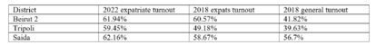 There is a significant increase in turnout compared to the expatriates and general 2018 turnout. Ranging from +1.5% in Beirut 2, to almost +10% in Tripoli and around +5% in Sidon.