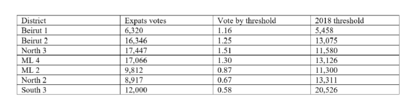 In another analysis of the expatriate voting by districts, the electoral Lab compared the number of voters to the 2018 threshold in an effort to find districts where the number of expatriates voting is significant enough to change the result by comparing the number of expatriates votes towards the 2018 threshold. Thus, there are four districts in which expatriates' votes are above the 2018 threshold. In these districts, the expatriate vote could very well change the overall results. They are Beirut 1&2, North 3, and Mount Lebanon 4 (Chouf, Aley).
