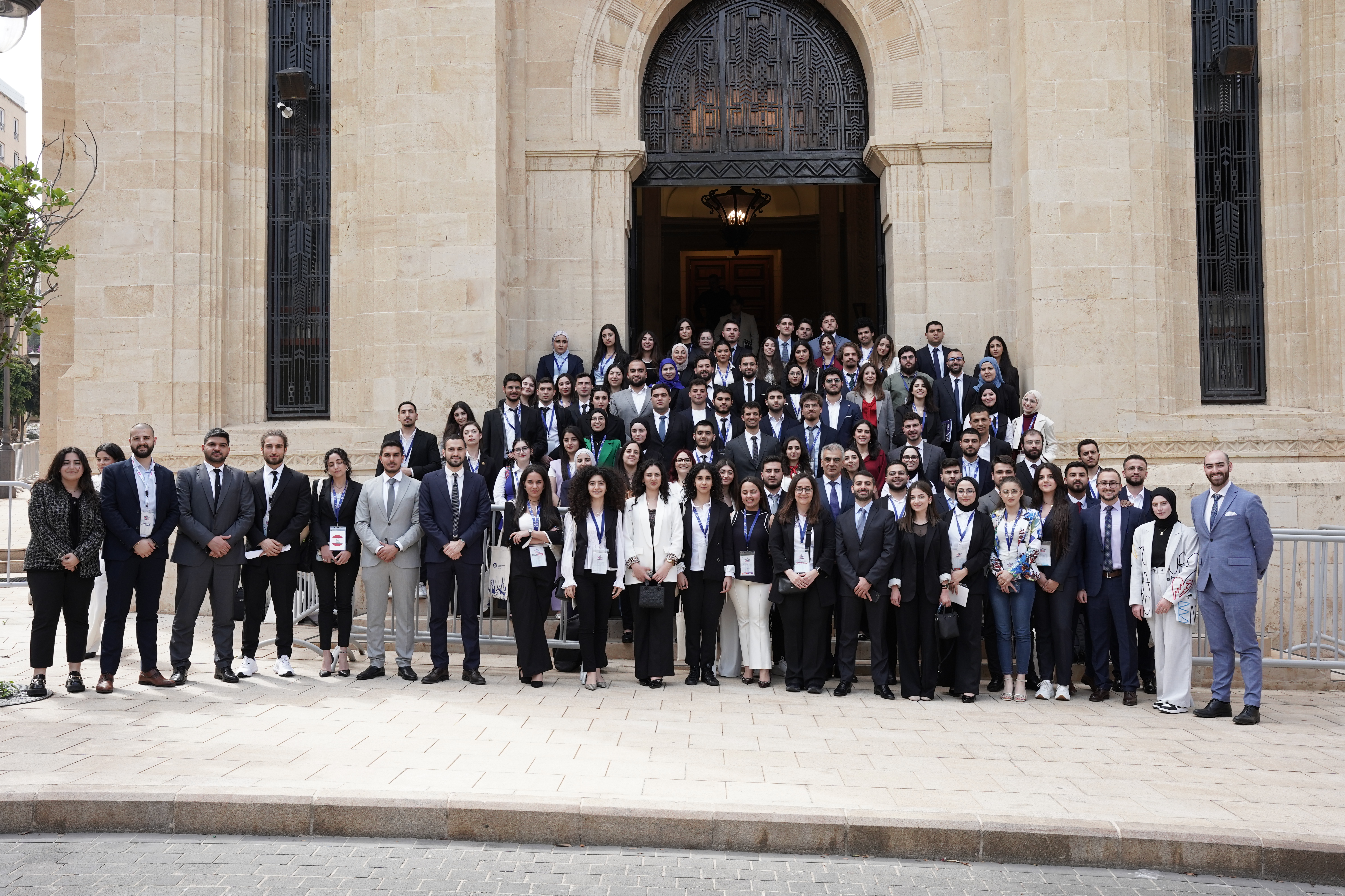 Participants and organizers of the 10th edition of the Model Youth Parliament stand outside the Lebanese Parliament