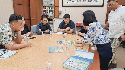 Mary, Program Manager at FNF Thailand, is demonstrating the mechanics of the SIM Democracy game to the representatives of GERAKAN Party and its youth wing.