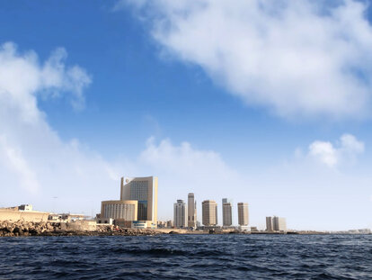 From the middle of the sea, next to the port of Tripoli / a quiet city, until you approach.