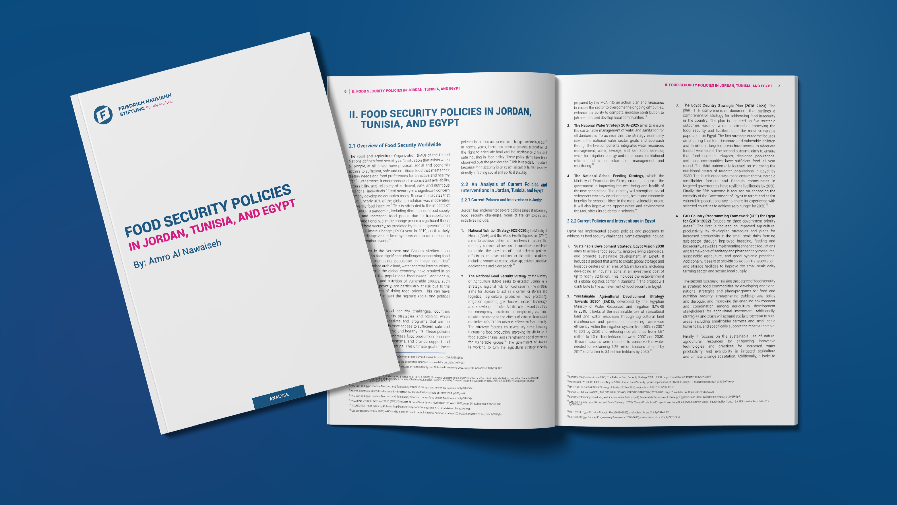 This publication will examine the food security policies in Jordan, Tunisia, and Egypt. The research will focus on the effectiveness of current policies in addressing food insecurity and malnutrition in these countries. The research will also identify any gaps or challenges in existing policies and suggest potential recommendations for improvement.