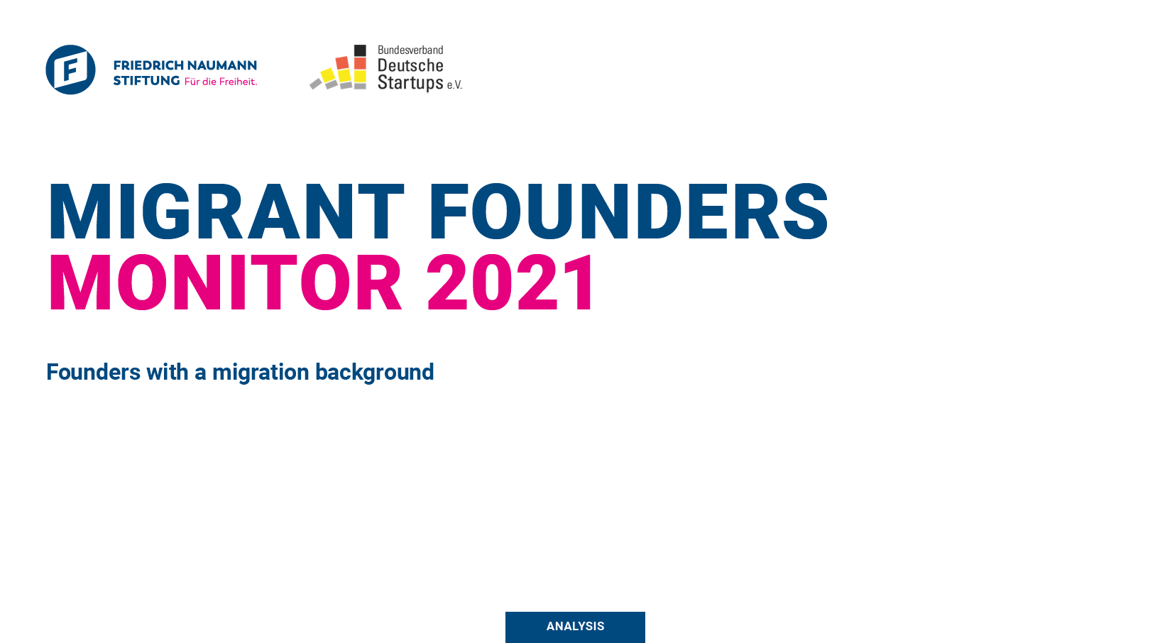 Founders with a migration background play an important role in the start-up ecosystem. With a share of a good 20 %, they are the driving force of economic innovation in Germany. The Migrant Founders Monitor 2021 examines for the first time the connection between migration and start-ups in Germany. The Friedrich Naumann Foundation for Freedom and the Bundesverband Deutsche Startups e.V. present the results in this publication.