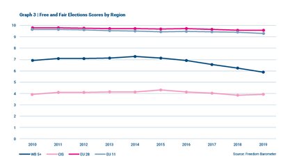 Having in mind that the group of WB 5+ countries encompasses Turkey, Serbia, and North Macedonia, i.e., countries which had from 2014 onwards “gotten a bad name” in almost all the freedom and democracy indices, it was no wonder that the scale in this region deteriorated the most. A consequence of the failed coup attempt in Turkey was a serious decline of political freedom in that country. The subsequent hostile political climate resulted in the imprisonment of many political activists and a referendum which changed the country’s parliamentary system into a presidential democracy through a procedure marred by frauds and irregularities. Democratic changes as of the beginning of the 21st century in Serbia hadn’t grown deep roots, thus making space for more conservative and nationalistic tendencies to occupy the political landscape. As a result, the abuse of legal – along with the use of extralegal – tools to prevent fairness of elections or even the free enjoyment of the right to vote became regular practices. As for North Macedonia, from the moment of its rejection by the EU due to the name dispute with Greece, it faced very hard and turbulent times of a rather politically repressive nature. The social tensions and violence that had lasted for a few years ended in 2017 with a change of government. Alas, North Macedonia is still waiting to restore the level of democracy it enjoyed at the beginning of the decade.