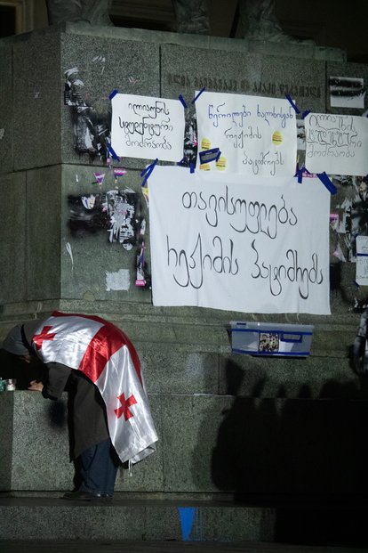 Protest action: A protester writes a letter to detained protesters on Rustaveli Avenue on January 6, 2025, organized by the protest movement of students from Ilia State University.