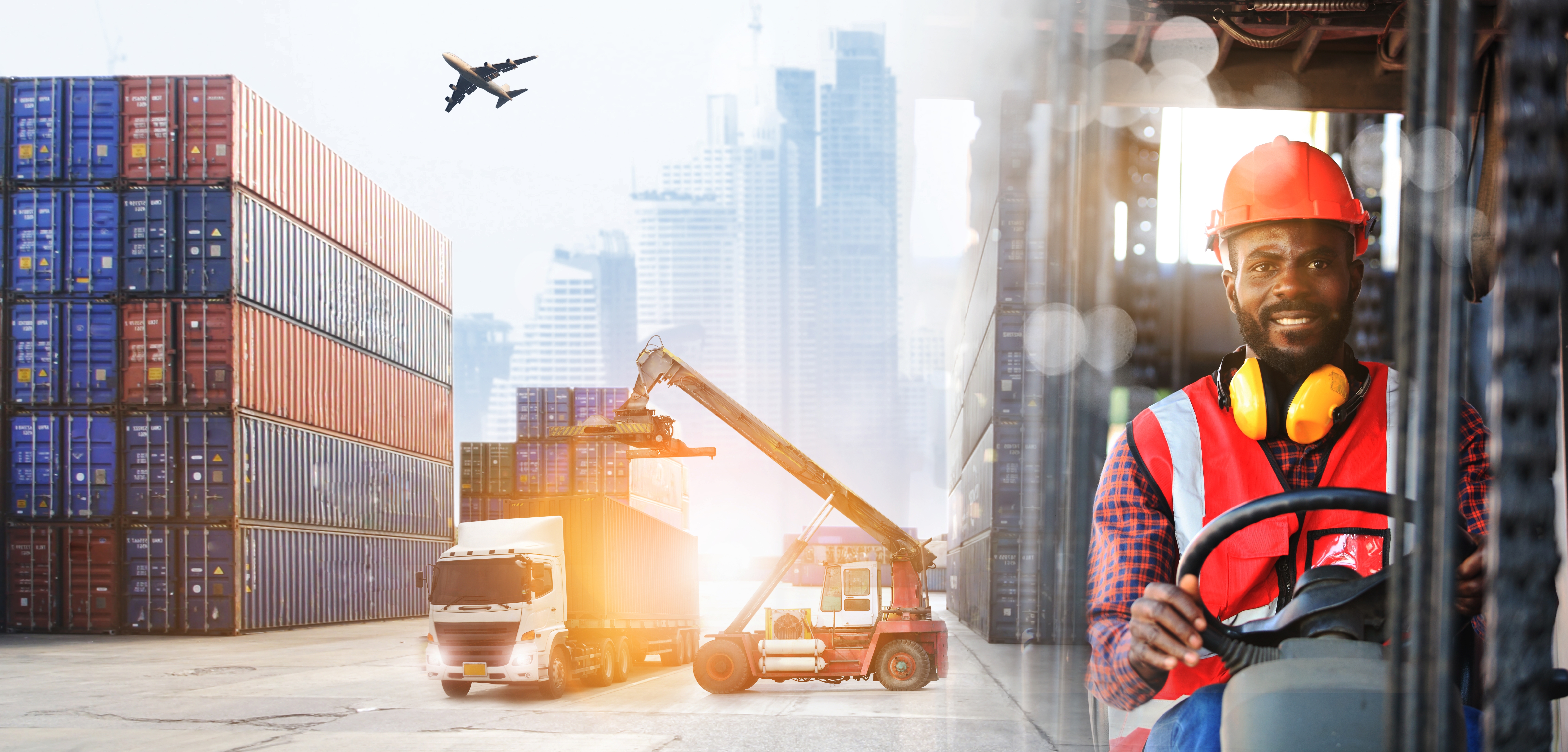 A person working in container area logistics transportation import export or shipping industry, delivery and logistics concept container truck transport or free-zone area