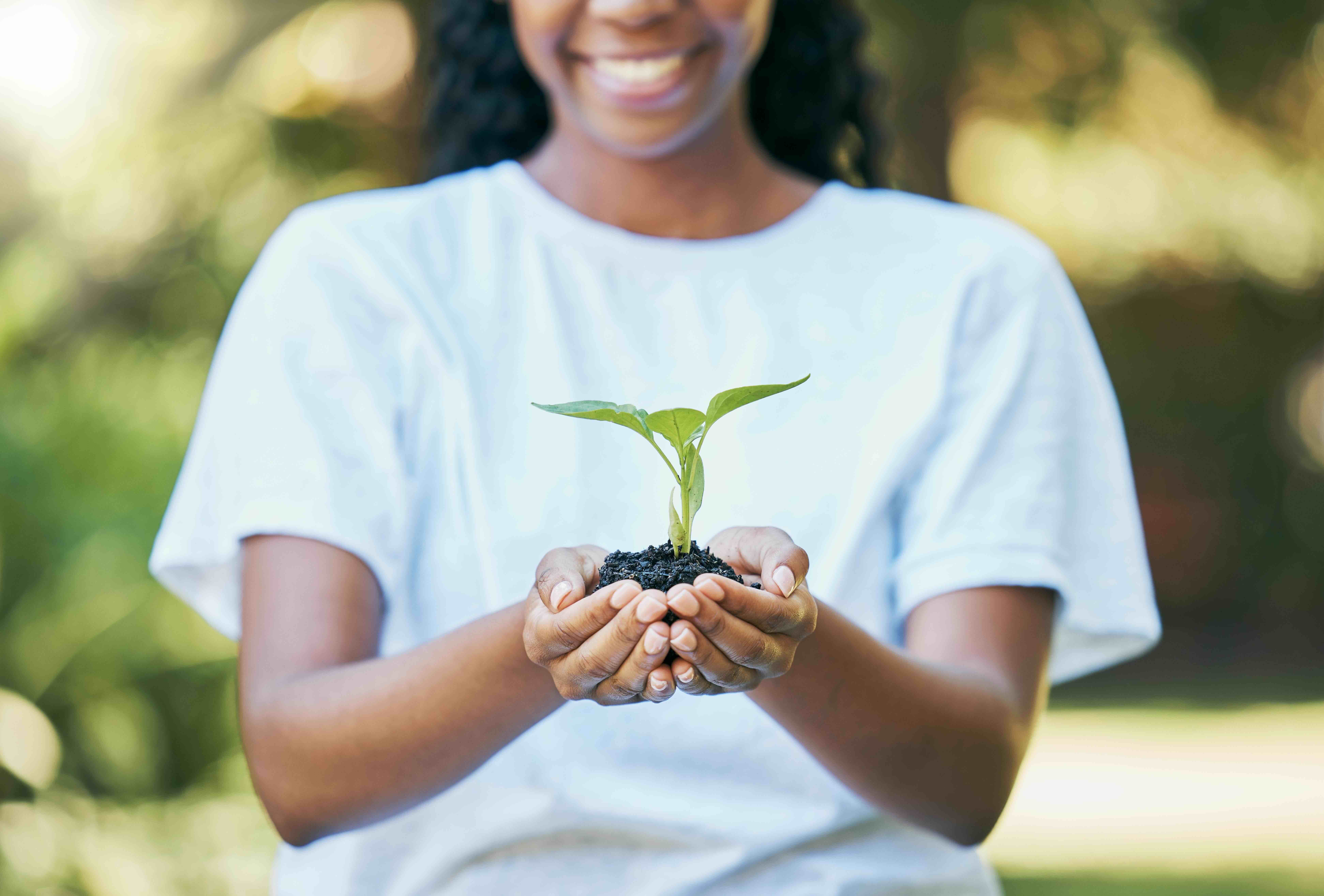 Eco friendly and sustainable person with soil in palm for agro volunteering