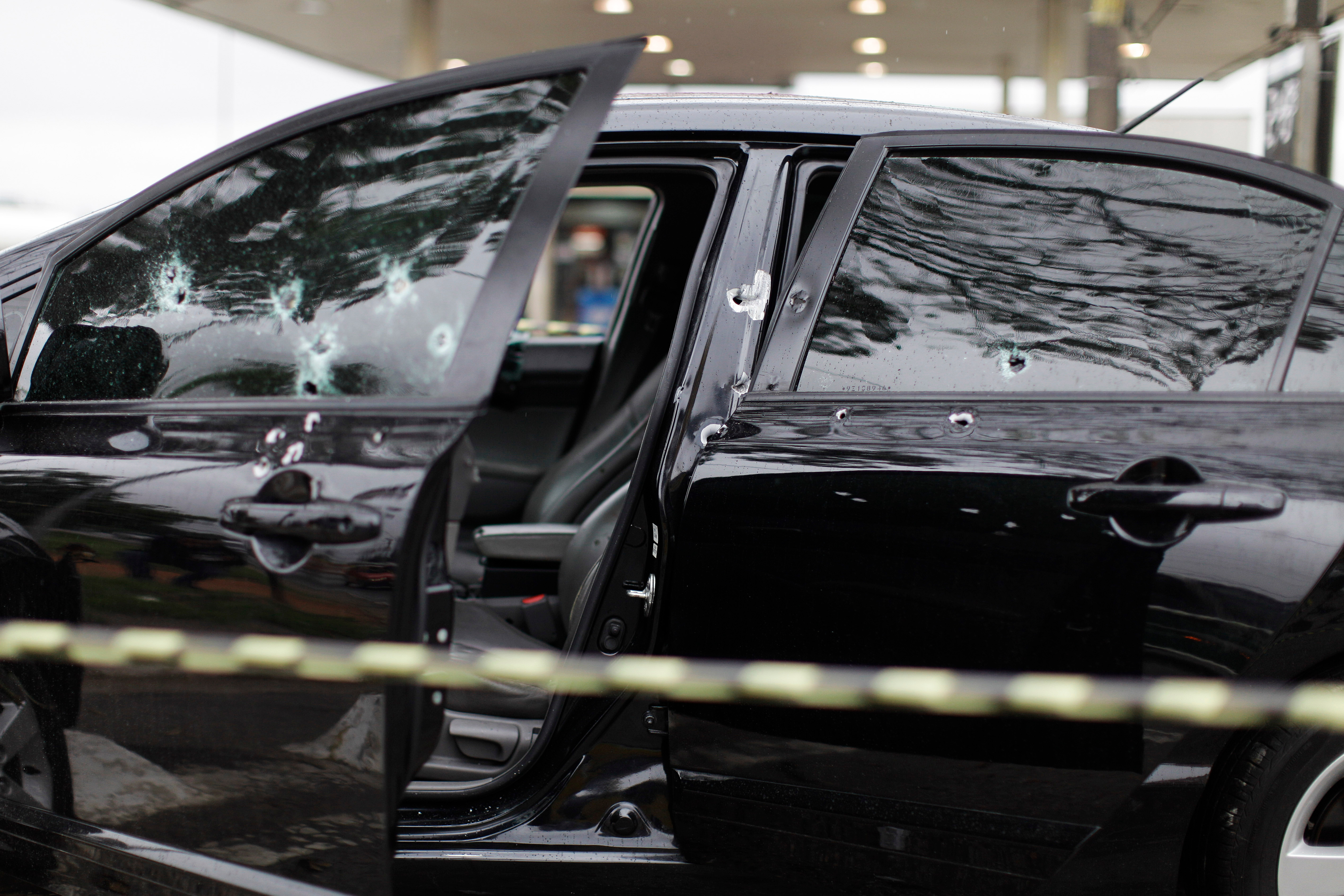 Bullet holes are seen in a car.