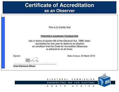 ©An international delegation will be joining the Friedrich Naumann Foundation for Freedom in Johannesburg, South Africa as official observers of the 2019 National & Provincial Elections from 3 - 10 May. FNF Africa attained an official observer accreditation certificate from the Independent Electoral Commission in South Africa.