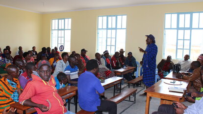 A Maasai community member speaking at an FNF human rights awareness workshop at a school Tanzanian.