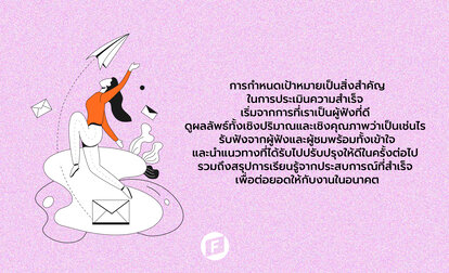 การกำหนดเป้าหมายเป็นสิ่งสำคัญในการประเมินความสำเร็จ เริ่มจากการที่เราเป็นผู้ฟังที่ดี ดูผลลัพธ์ทั้งเชิงปริมาณและเชิงคุณภาพว่าเป็นเช่นไร รับฟังจากผู้ฟังและผู้ชมพร้อมทั้งเข้าใจและนำแนวทางที่ได้รับไปปรับปรุงให้ดีในครั้งต่อไป รวมถึงสรุปการเรียนรู้จากประสบการณ์ที่สำเร็จ เพื่อต่อยอดให้กับงานในอนาคต