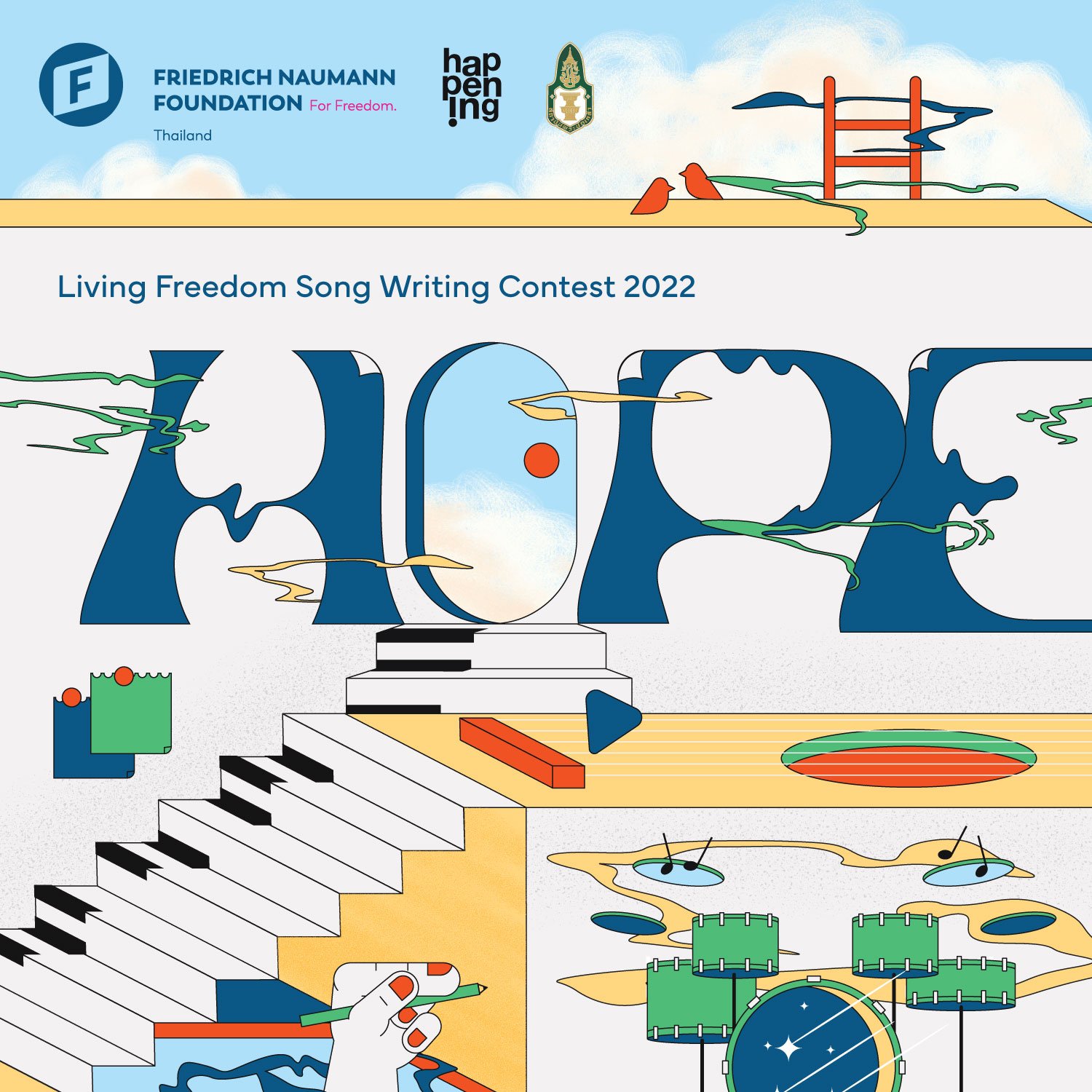 งาน Living Freedom Song Writing Contest 2021: Hope มีเจ้าภาพคือมูลนิธิ Fnf Thailand ที่ทำหน้าที่ให้ความรู้เรื่องสิทธิเสรีภาพและประชาธิปไตยมาอย่างยาวนาน ร่วมจัดโดย happening และสถาบันพระปกเกล้า