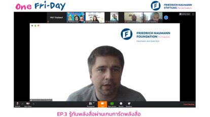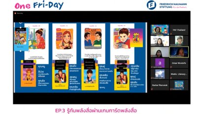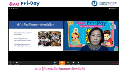 กิจกรรม One Fri-day ตอนที่ 3 รู้เท่าทันสื่อกับเกมการ์ดพลังสื่อ วันที่ 17 เมษายน พ.ศ. 2563 คุณเฟรดเดอริค ชปอร์ หัวหน้าสำนักงานประเทศไทย ได้มาร่วมแลกเปลี่ยนเกี่ยวกับการรู้เท่าทันสื่อ จากประสบการณ์อดีตผู้สื่อข่าว คุณเฟรดเดอริคเห็นว่าการรู้เท่าทันสื่อเป็นเรื่องสำคัญมาก กรณีการระบาดของไวรัสโควิด19 เป็นตัวอย่างของการระบาดของข้อมูล เนื่องจากมีข้อมูลมากมาย ก่อให้เกิดความสับสน ประกอบกับการสื่อสารขยายกว้างไปกว่าผู้สื่อข่าววิชาชีพ ด้วยเทคโนโลยีการสื่อสารและพื้นที่ ทำให้สังคมเต็มไปด้วยผู้สื่อข่าวที่ไม่ได้ถูกฝึกฝน ทำให้การตรวจสอบข้อมูล เนื้อหา หรือการประเมินความน่าเชื่อถือของข้อมูลมีความยากมากขึ้น เกมการ์ดพลังสื่อจึงเป็นจุดเริ่มต้นที่จะพาเรากลับไปตั้งคำถามกับสื่อ เช่น ใครเป็นเจ้าของหรือเบื้องหลังสื่อนั้น เขามีวาระแอบแฝงอะไร หรือต้องการอะไรจากผู้รับสื่อหรือเปล่า เหล่านี้เป็นคำถามที่เราต้องตั้งคำถามและตอบกับตัวเองให้ได้