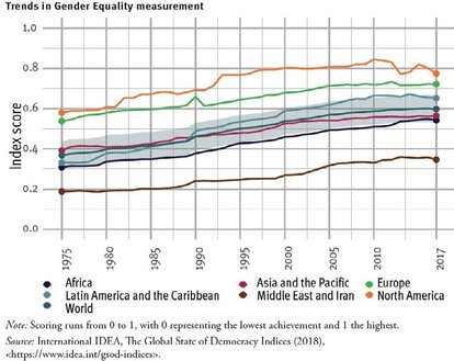 Cinsiyet eşitliği son 42 yılda kayda değer bir ilerleme gösterdi ve bu gelişme dünyadaki her bölgede meydana geldi (bakınız Şekil 1). Latin Amerika ve Karayipler, 1975'te 0,33'ten 2017'de puanını neredeyse iki katına çıkararak en büyük gelişmeleri gösteren bölge olmuştur. Afrika, 1975'te 0,32'yken 2017'de 0,54'e yükselerek ikinci en hızlı iyileşme oranını göstermiştir. Asya ve Pasifik, 1975 yılında en düşük seviyelerde başlayan ve o zamandan bu yana en düşük iyileşme oranını gösteren bölge olan Orta Doğu ve İran'dan sonra ikinci en yavaş iyileşme oranına sahiptir. Ülke düzeyinde, İspanya, Ekvador, Kosta Rika, Nepal ve Ruanda (yukarıdan aşağıya doğru), 1975'ten bu yana cinsiyet Eşitliği ölçümünde en büyük gelişme gösteren ülkelerdir.