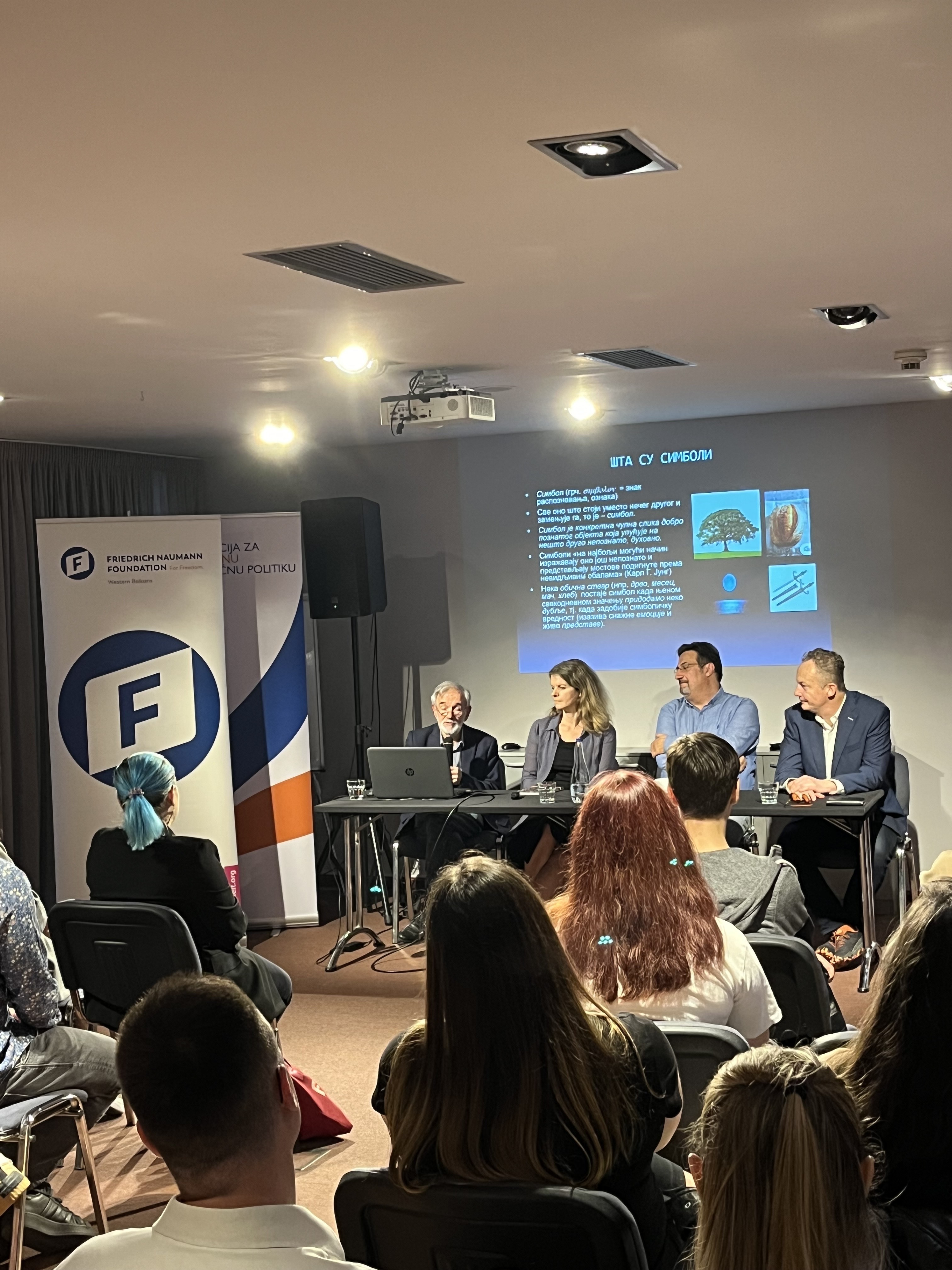 While Prof. Trebješanin's presentation was dedicated to the definition of the concept of symbols and their difference from signs, Dr. O'Brien focused on the importance of symbols for the individual development of each person. Afterwards, Danijel Pantić, Chairman of FLPP, presented several examples of the use of symbols in politics, followed by an open discussion on the way politicians in Serbia misuse symbols to influence the "collective unconsciousness" of citizens.