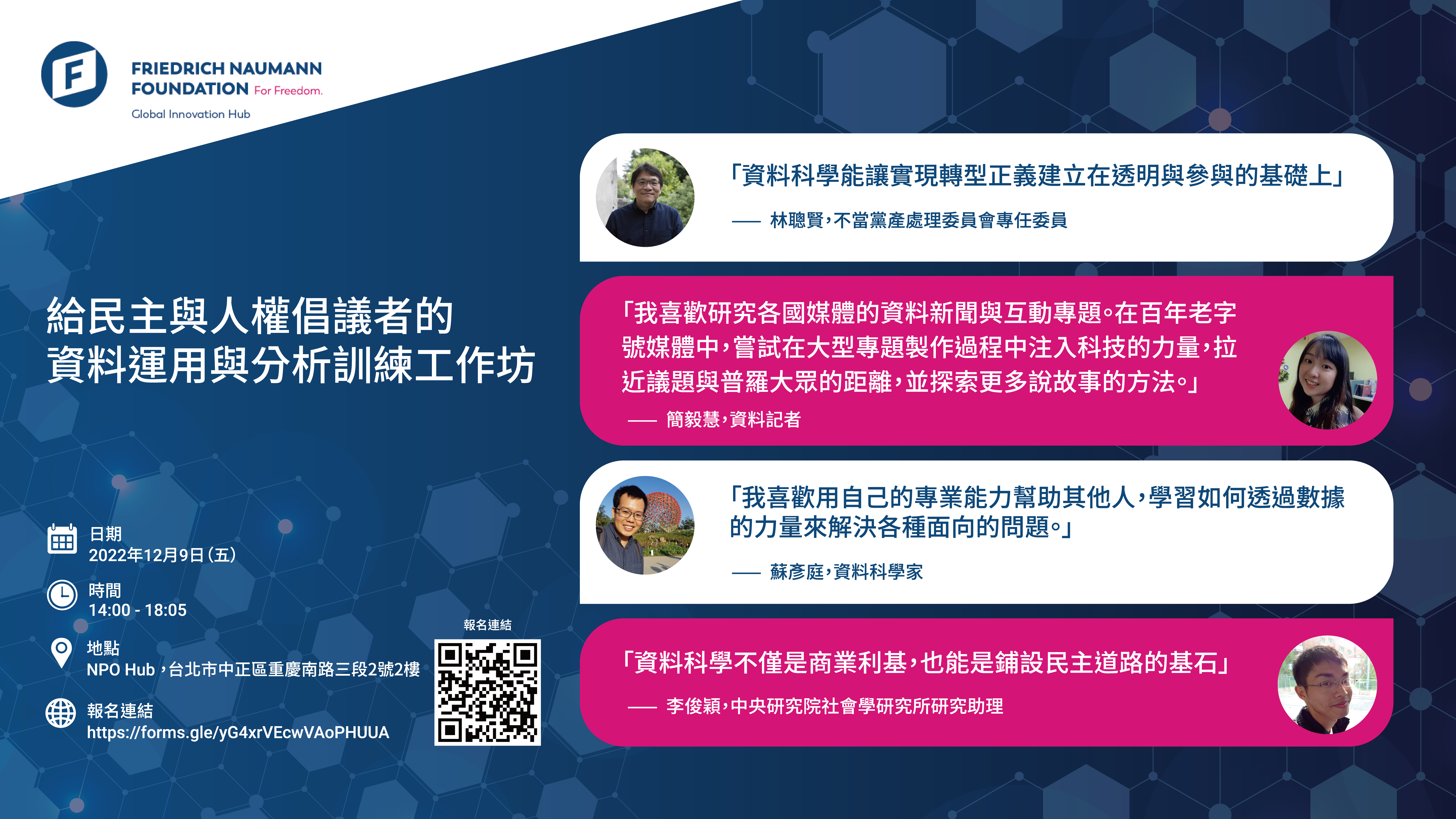 在12月9日的「給民主與人權倡議工作者的資料運用訓練工作坊 」舉辦之前,讓我們來聽聽與談人分享他們如何建立不當黨產處理委員會的文本分析系統與數位敘事專題計畫!想要聽他們親自講述這些經驗嗎?可以點擊這邊報名工作坊喔!