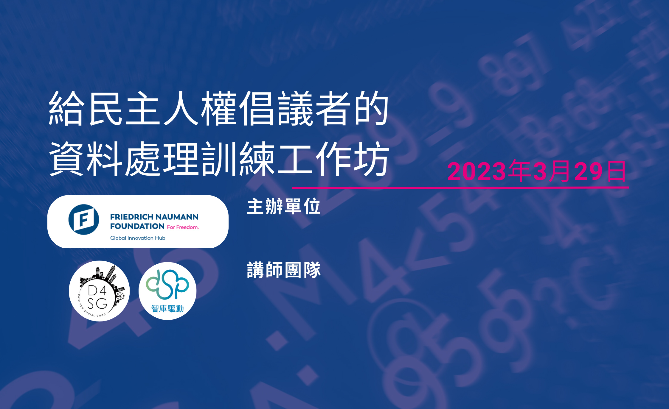 弗里德里希諾曼自由基金會將於2023年3月29日(三)下午1:00-5:00,在犇亞會議中心(PCBC)15樓CC會議室舉行本訓練課程,增進民主人權倡議者對資料(data)處理之技術與能力。報名者須為從事民主人權倡議工作或相關議題之非營利組織或個人工作者,本會將審核報名資料,錄取15名參與者,請於3月17日前點此報名。