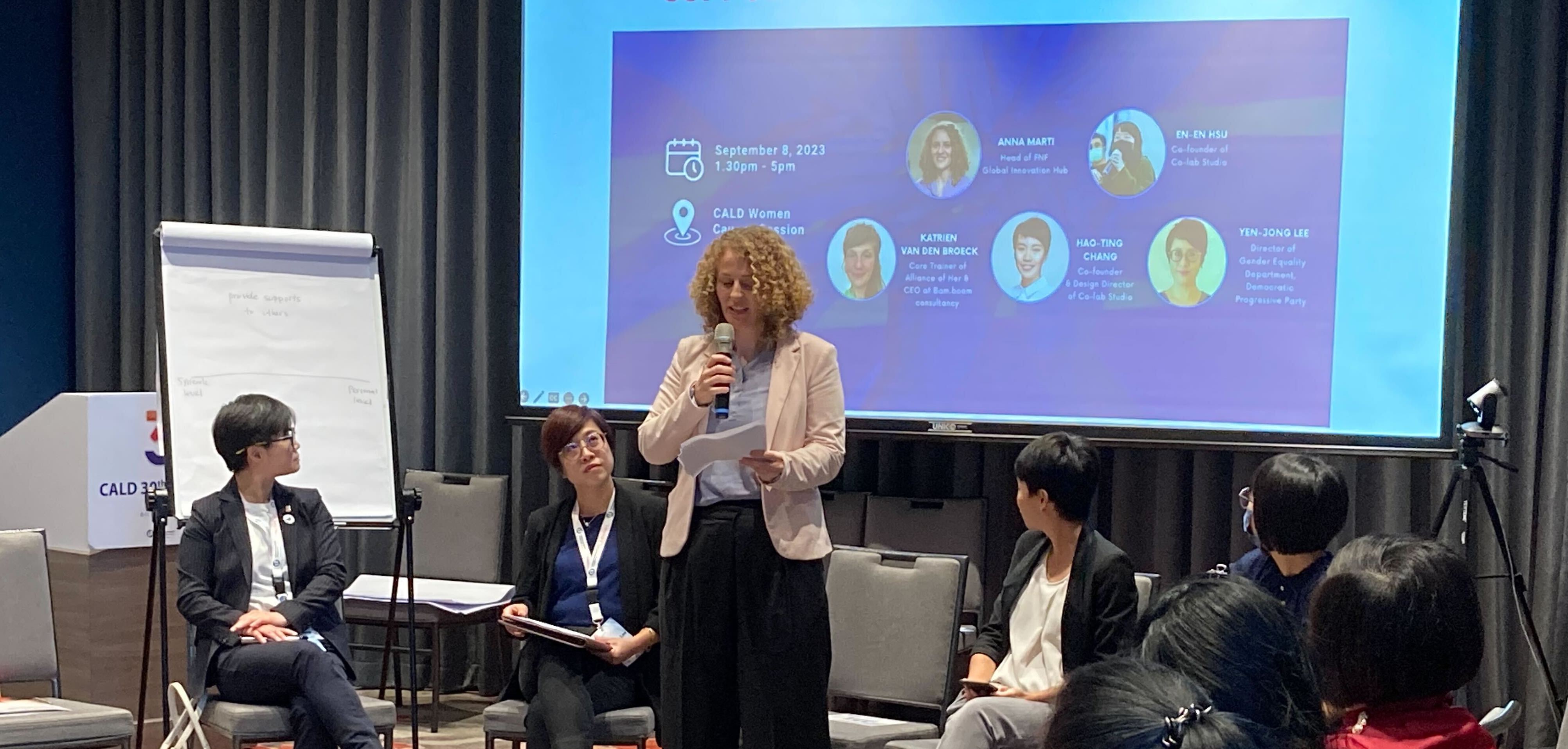 FNF全球創新中心總監Anna Marti在「自由主義政黨該做什麼來支持其女性同仁?」工作坊上進行開幕致詞,其為亞洲自由民主聯盟(CALD)於台北舉辦的女權連線培訓其中的一場活動。